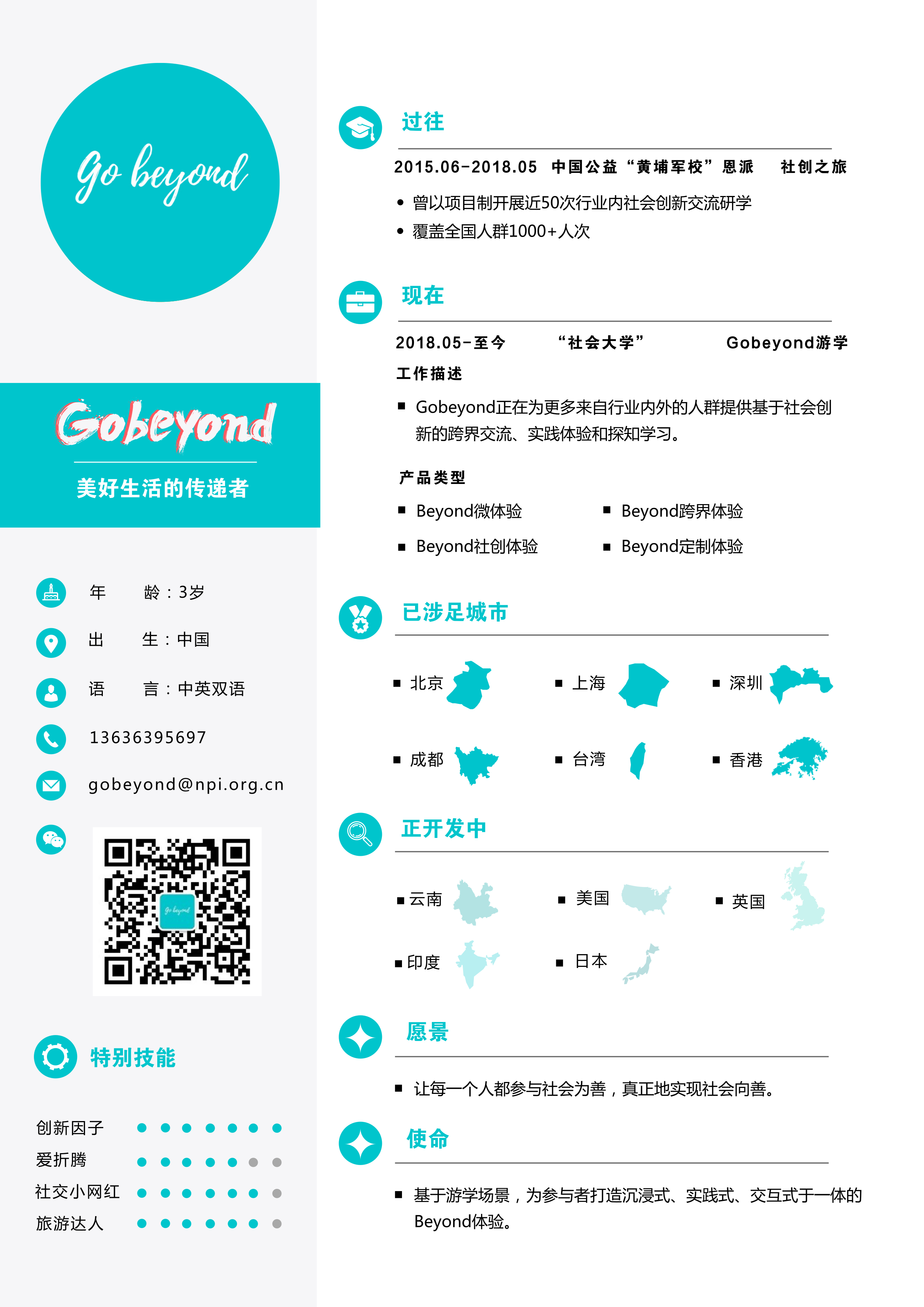 - Go Beyond簡介 Go Beyond意指“超越”,音似“夠別樣的”。依托恩派的資源網(wǎng)絡(luò),Go Beyond旨在為社會創(chuàng)新業(yè)內(nèi)人士提供深度專業(yè)、寓學(xué)于游的定制體驗。此外,Go Beyond還計劃為大眾提供豐富有趣、主題鮮明的社會創(chuàng)新體驗。Go Beyond希望每一個人都能通過社會創(chuàng)新體驗,發(fā)現(xiàn)社會有善,參與社會向善。 Go Beyond特色 面向日新月異的全球互聯(lián)時代,Go Beyond計劃將社會創(chuàng)新游學(xué)升級為更具時代感的創(chuàng)新產(chǎn)品,創(chuàng)造基于社會創(chuàng)新的新興游學(xué)場景,打造集賦能教育、實踐體驗于一體的復(fù)合式游學(xué)產(chǎn)品,制造深入情境的互動氛圍,營造全球社會創(chuàng)新的社交網(wǎng)絡(luò)。 Go Beyond產(chǎn)品 Go Beyond現(xiàn)有四個品牌產(chǎn)品,分別為Beyond微體驗,Beyond跨界體驗,Beyond社創(chuàng)體驗,以及Beyond定制體驗,分別從不同人群、不同領(lǐng)域、不同程度讓大眾感受體驗別樣的社會創(chuàng)新教育。